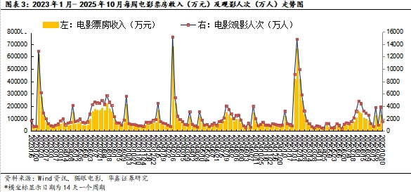 2025年国庆档收官。2025年国庆档(2025年10月1日至8日)票房(不含服务费)16.4亿元,较2024年国庆档的19.08亿元下滑13.99%,观影人次0.5亿次(较2024年国庆档0.52亿次下滑3.8%),区间均票价32.7元(较2024年国庆档36.6元下滑10.66%),2025年国庆档票房、观影人次、均价三因子均下滑,核心仍是影片内容未现黑马。2025年国庆档在假期多一天背景下票房仍下滑,且票价同比也下滑大背景下,票房表现差强人意凸显内容压力。2025年国庆档冠军影片《志愿军:浴血和平》的区间分账票房4.06亿元,2024年同期冠军影片《志愿军:存亡之道》的区间分账票房7.36亿元,2025年冠军影片区间票房同比下滑44.8%;映前高关注度的动画电影《三国的星空第一部》区间票房仅为0.67亿元,不及预期;2025年国庆档影片总体质量中规中矩,黑马影片缺席,电影的内核仍是供给创需求,后续贺岁档影片能否抓住年尾行情,用好看的影片拉回观众仍是从业者需思考与努力的方向。
