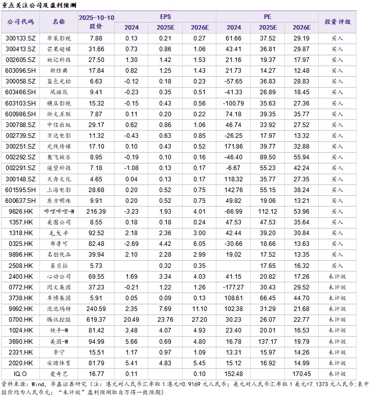 个股跟踪: A股可关注,东方明珠600637(作为国有文化传媒集团排头兵,AI时代有望开启增长新引擎,通过股权投资方式受让超聚变数字技术有限公司股权,2025年10月旗下百视通云游戏正式登陆长虹电视大屏,后续还将逐步覆盖更多主流智能电视品牌终端,并延伸至特斯拉、理想等车载智能屏,实现家庭、出行等多生活场景渗透);芒果超媒300413(新综艺《声鸣远扬》9月海选并将有望10月底开启直播,大芒剧场《少年田野》定档10月13日);蓝色光标300058(将受益于Sora2助力内容营销,战略投资PureblueAI清蓝,延安小青马数字藏品正式发行);万达电影002739(国庆档板块性承压,关注万达后续影片供给以及非票收入通过创新拉动创收,万达电影IP售卖业务还储备《疯狂动物城》系列IP、初音未来、《小马宝莉》系列IP等);汤姆猫300459(《汤姆猫总动员2》成汤姆猫海外新晋主力产品,关注后续AI新品供给,同时数字营销业务也有望受益Sora2以及字节跳动产业链);奥飞娱乐002292(拥有“超级飞侠”“喜羊羊”等IP矩阵,已推出集换式卡牌产品,看后续毛绒品类拓展,也将受益AI+陪伴赛道);中信出版300788(央企,大众阅读头部企业主业持续具韧性,夸父AI数智出版平台持续提质增效,IP运营与内容生态构建加速,IP相关图书如《哪吒·三界往事》《黑神话·悟空》《影神图》等);华策影视300133(国庆档虽略承压但作为剧集龙头有望持续受益Sora2,布局算力已初见成效,投资加码短剧外,积极布局AI,间接投资智谱华章);姚记科技002605(看后续主业修复回暖进展,关注卡牌板块热度拉动情绪);天舟文化300148(教辅与游戏双主业业绩增长,新业务AI+教育可期,2025年7月推出AI练字教育产品);荣信文化301231(加速AI场景落地,多款AI助读智能体正式上线);上海电影601595(电影《浪浪山小妖怪》拉动周边衍生品热销,也将受益IP+文旅赋能消费新场景);横店影视603103(国庆档承压,看后续借力横店的影视产业资源,加强文旅业务融合,推动构建影视产业生态新发展);浙文互联600986(全链路AI布局再迎发展新机遇,深耕“AI+营销”“AI+文化”“算力+融租”三大产业链,全面推动人工智能从技术研发向场景应用与产业落地转化,着力构建“技术-场景-产业”全链路闭环生态);港股可关注,B站9626(已开启双十一招商预热,2025年业绩有望持续向好,以优质内容为支点也是创越周期的核心,社区视频商业价值有望再升);腾讯0700(2025年8月新游《无畏契约:源能行动》表现优异,关注AI驱动内容进展);阿里9988(加码AI与消费,以AI为支点撬动时代红利,阿里通义千问多模态模型正从“感知智能”向“行动智能”跨越,演进为能执行长期复杂任务的“基础代理,并已组建一支“小型机器人与具身AI团队”);阜博集团3738(作为全球领先的数字内容保护与交易服务提供商,阜博集团以数字内容收益开拓RWA新路径作);美图1357(2025年9月与阿里巴巴通义实验室达成合作,通义万相系列前沿AI模型将助力美图旗下产品,为全球美图用户提供全新智能影像体验);布鲁可0325(2025年10月将发布三丽欧家族系列、宝可梦经典版、超级站队群星版第二弹);圣贝拉2508(以女性为支点撬动产后护理和修复市场,小红书的另一种表达,2025年上半年业绩增长向好,关注后续出海与AI的进展);毛戈平1318(国庆期间美妆品类表现尚可,等待后续开店进展);名创优品9896(9月26日TOPTOY向香港联交所提交上市申请,拆分上市)。