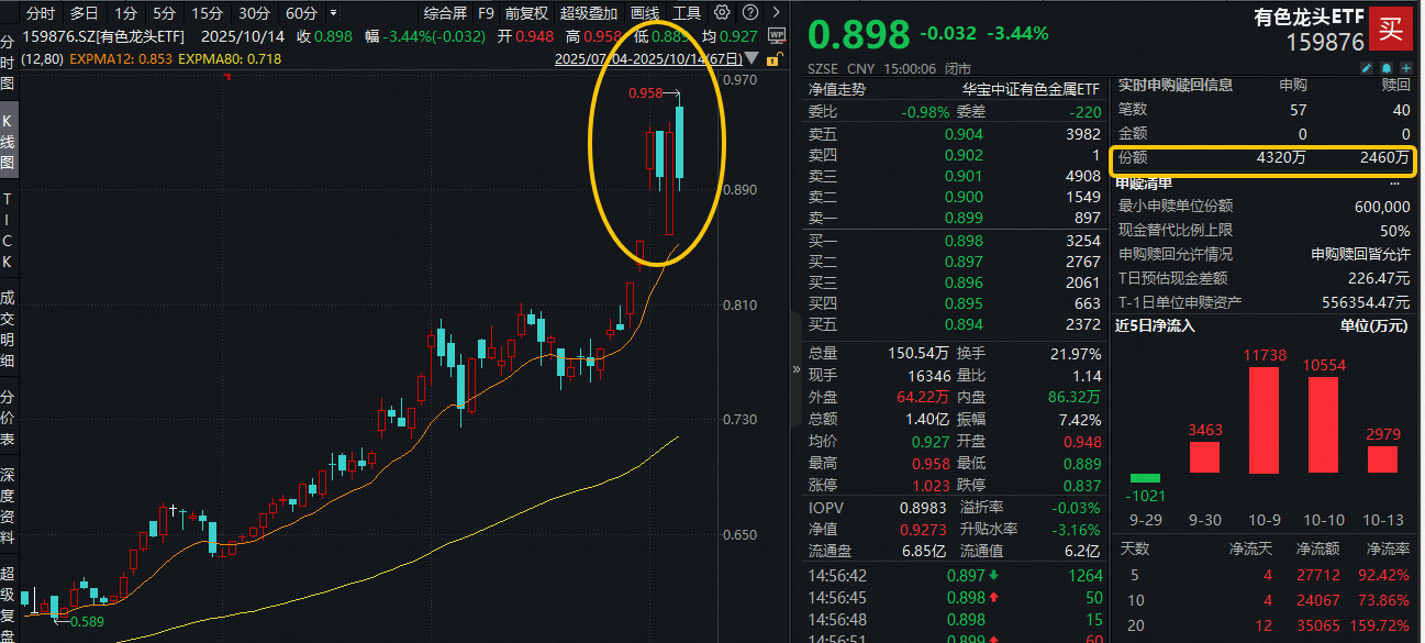 今日(10月14日)揽尽有色金属行业龙头的有色龙头ETF(159876)早盘延续涨势,场内价格一度上探2.58%,再创上市新高,后随市盘整回调,场内价格最终收跌3.44%,全天成交额1.4亿元,交投火热!