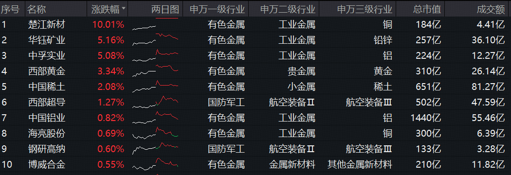 成份股方面,楚江新材一字涨停,华钰矿业、中孚实业涨超5%,西部黄金涨逾3%,中国稀土涨逾2%,涨幅居前。另一方面,腾远钴业跌超11%,寒锐钴业、华友钴业跌逾7%,跌幅居前,拖累指数表现。