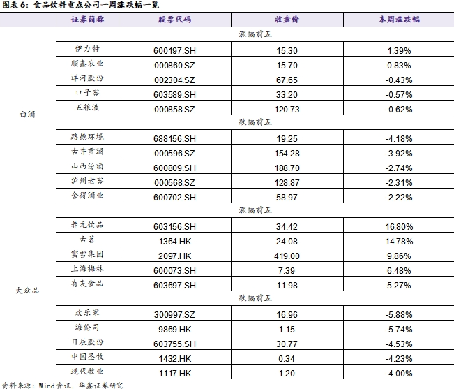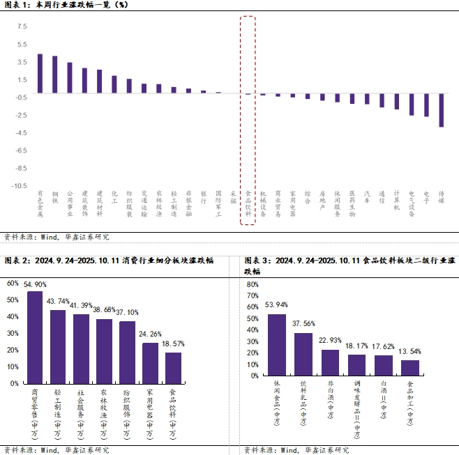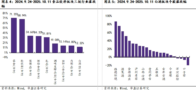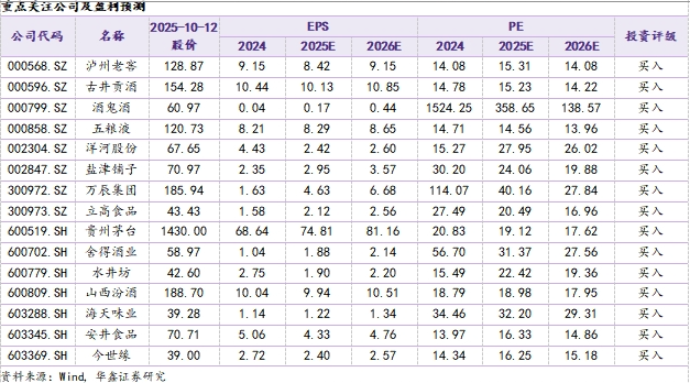 白酒板块:双节白酒动销边际改善,同比承压。白酒动销边际下滑幅度基本符合预期,渠道库存小幅去化,但仍处于相对高位,后续年末任务量压力下,预计批价趋势承压,酒企以控量挺价为主要任务。同时,白酒消费场景与价格带表现依旧分化,宴席与自饮场景相对刚性,政商务场景环比改善,但同比压力明显。整体来看,白酒需求仍在磨底阶段,建议关注具备长期配置价值的高股息龙头:贵州茅台、五粮液、泸州老窖、汾酒等,以及优先出清、回调到位的弹性个股:酒鬼酒、舍得酒业、今世缘、珍酒李渡等。