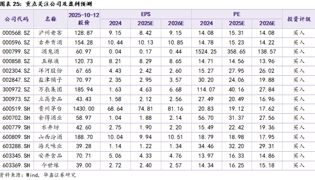 双节白酒动销边际改善,同比承压。白酒动销边际下滑幅度基本符合预期,渠道库存小幅去化,但仍处于相对高位,后续年末任务量压力下,预计批价趋势承压,酒企以控量挺价为主要任务。同时,白酒消费场景与价格带表现依旧分化,宴席与自饮场景相对刚性,政商务场景环比改善,但同比压力明显。整体来看,白酒需求仍在磨底阶段,建议关注具备长期配置价值的高股息龙头:贵州茅台、五粮液、泸州老窖、汾酒等,以及优先出清、回调到位的弹性个股:酒鬼酒、舍得酒业、今世缘、珍酒李渡等。