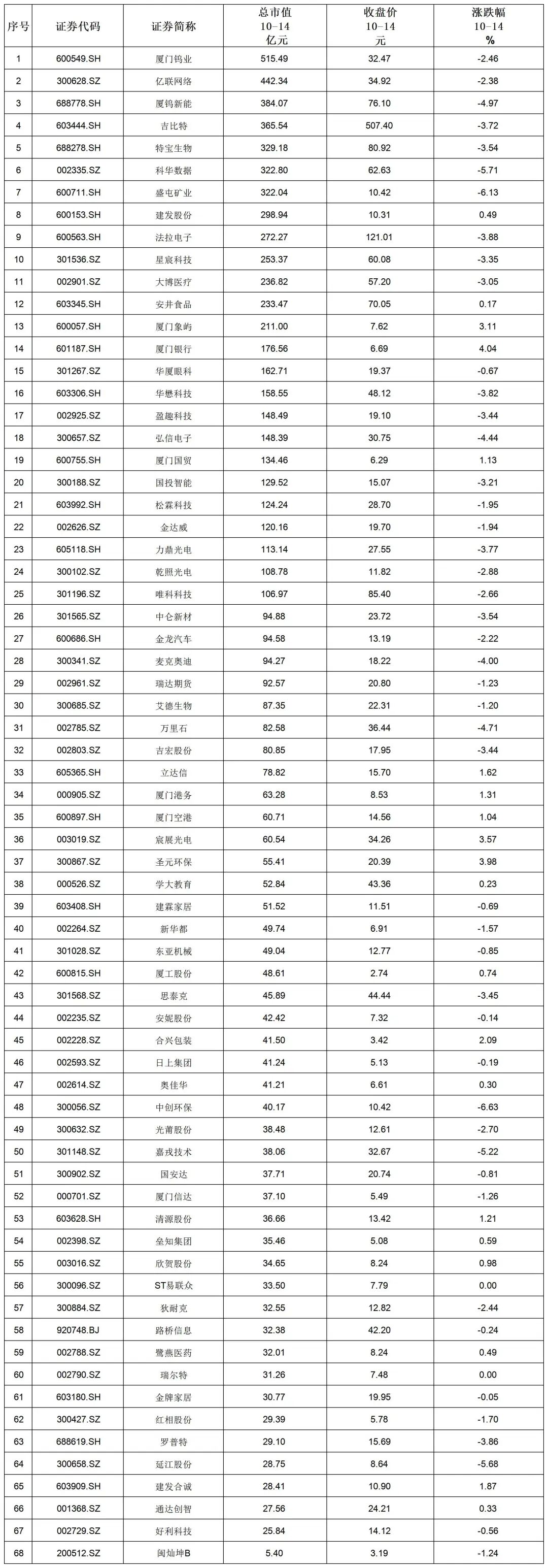 10月14日,上证综指下跌24.27点,跌幅0.62%,收盘于3865.23。辖区内上市公司总计68家,总市值7894.34亿元。