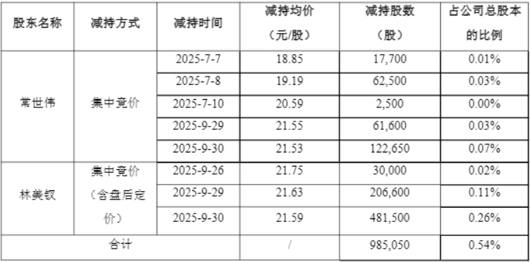 公司于2025年6月11日披露了《关于部分董事、高级管理人员减持股份的预披露公告》(公告编号:2025-042)。公司董事林美钗女士和高级管理人员常世伟先生合计持有公司股份7,364,000股(占公司总股本比例为4.0505%),上述股东计划在减持公告披露之日起15个交易日后的3个月内以集中竞价方式合计减持公司股份不超过1,017,000股(占公司总股本比例为0.5594%)。