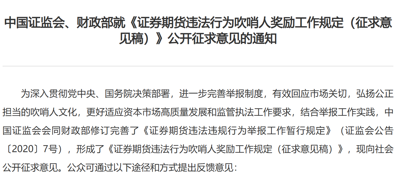 同日,中国证监会、财政部就《证券期货违法行为吹哨人奖励工作规定(征求意见稿)》公开征求意见的通知。在征求意见稿提出对符合奖励条件的吹哨人,每案按罚没款金额的3%进行奖励,每案最高不超100万元。与此同时,为了防止上市公司被无故举报,还规定了吹哨人提供虚假信息或严重破坏证券市场秩序的相应给予的惩治,严重者涉及刑事犯罪。