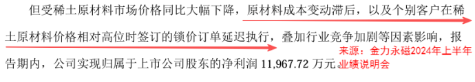 2024年,金力永磁毛利率降至11.13%,同比下滑约5个百分点,全年净利润同比下滑48.37%。