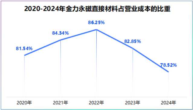 2020-2024年,直接材料成本占公司主营成本的比重稳定在80%左右,原材料成本直接决定了金力永磁的毛利率空间。