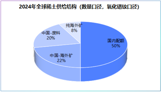 整个氧化镨钕供给市场看,我国配额占全球稀土供应的50%,进口至我国进行冶炼分离的海外稀土矿占22%,而完全由海外开采、冶炼的稀土占比不到10%。