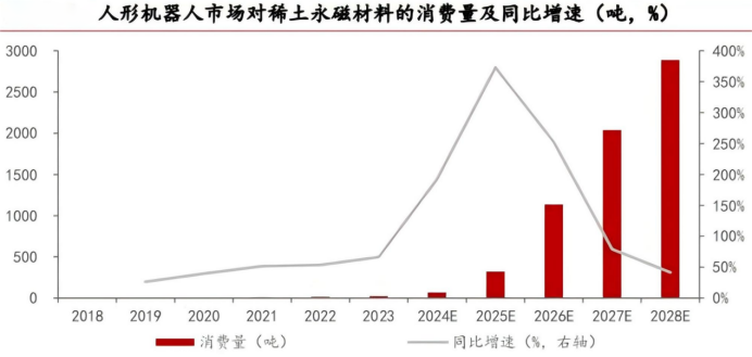 行业预测,到2028年全球人形机器人对稀土永磁的消费量为2887.6吨,2023-2028年复合增速约162%。