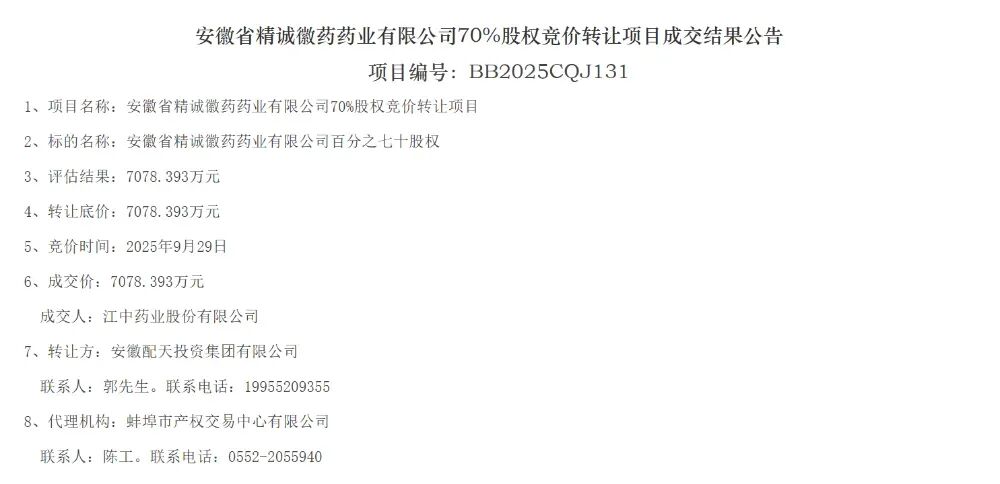 2024年10月,蚌埠市国资委下属的蚌埠投资集团有限公司取得安徽配天投资集团100%股权。2025年8月6日,精诚徽药的投资人进行了变更,安徽配天投资集团成为精诚徽药唯一股东。