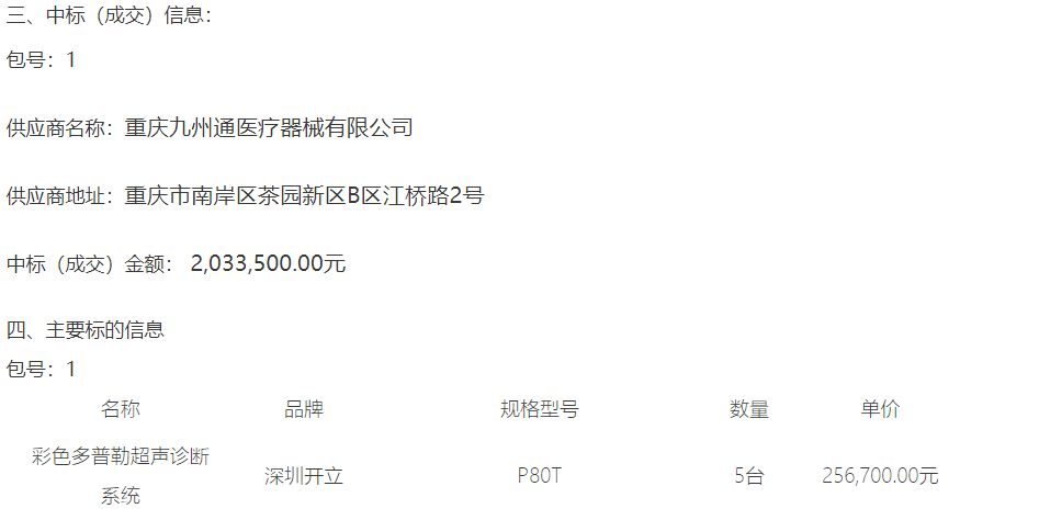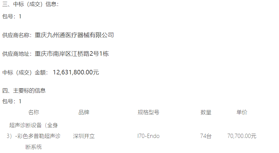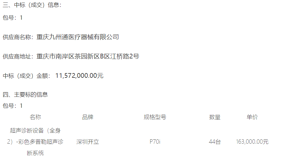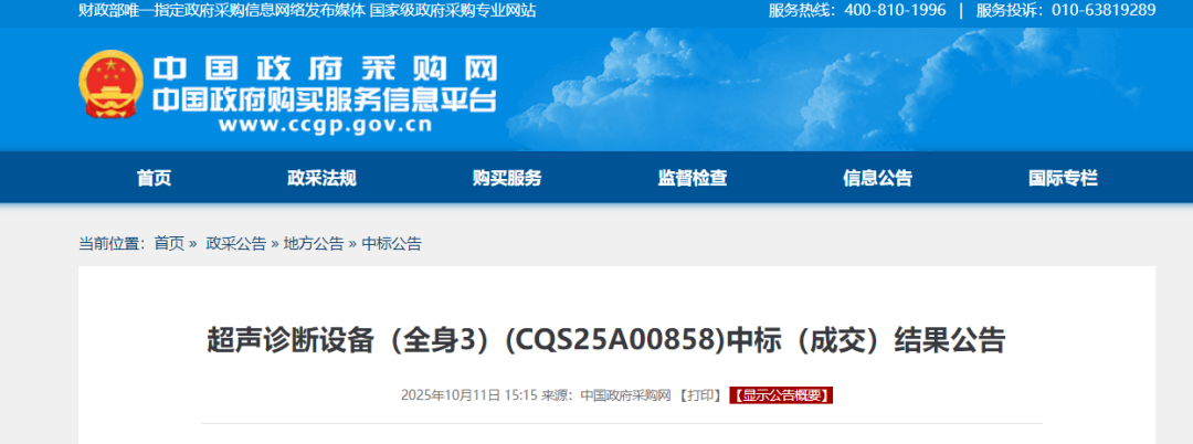 10月11日,中国政府采购网发布了《超声诊断设备(全身3)(CQS25A00858)中标(成交)结果公告》。