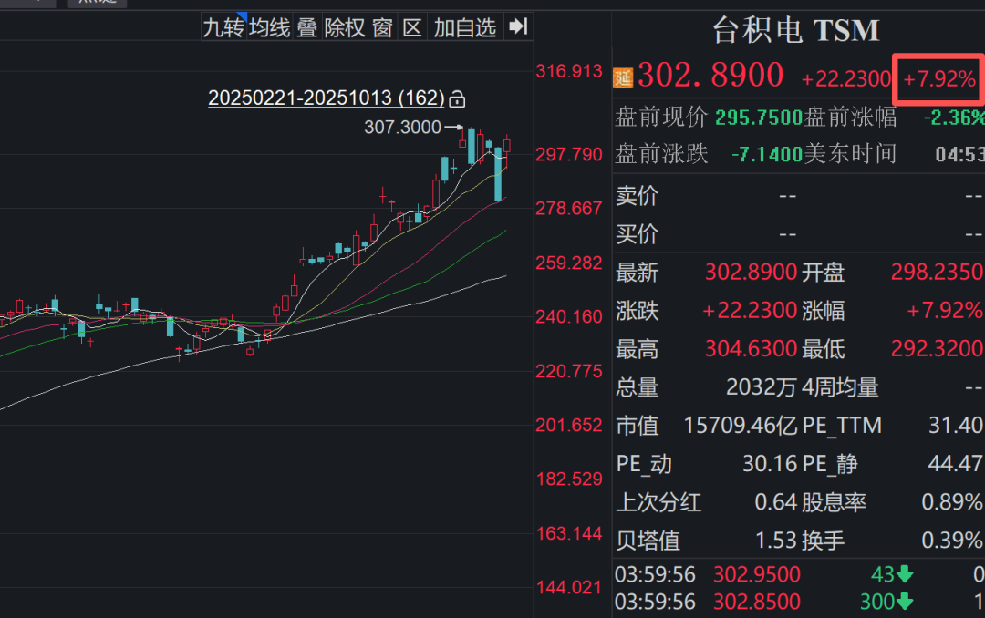 受此消息提振,台积电美股大涨7.92%,收复上周跌幅。