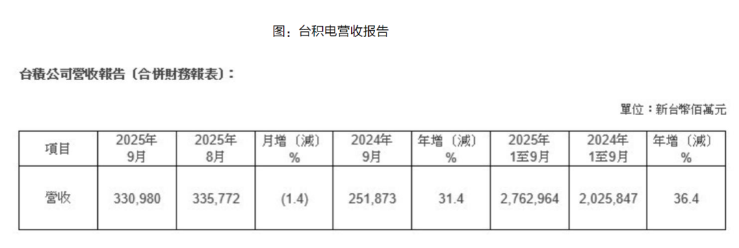 此外,10月9日,公司公布其9月销售额3309.8亿元新台币,同比增长31.4%,今年以来累计销售额同比增长36.4%。经计算,其7至9月营收为9899.2亿元新台币(约合324.7亿美元),同比增长30%,超出市场预期。