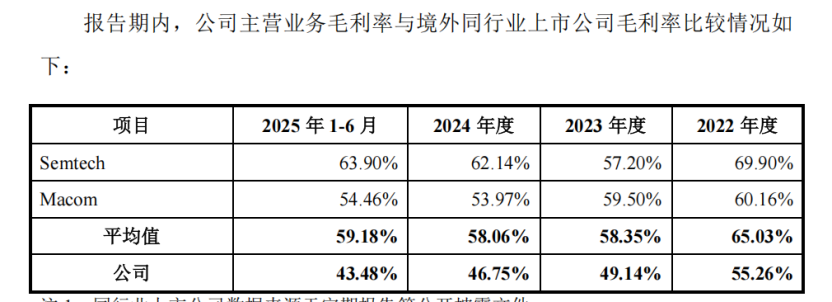 2022年至2025年上半年,优迅股份营业收入分别为3.39亿元、3.13亿元、4.11亿元,2.39亿元,扣除非经常性损益后的净利润分别为9,573.14万元、5,491.41万元、6,857.10万元、4,168.69万元,主营业务毛利率分别为55.26%、49.14%、46.75%、43.48%,总体呈现下跌趋势。而占据公司八成以上收入的光通信收发合一芯片,其毛利率由54.03%下滑至43.75%。