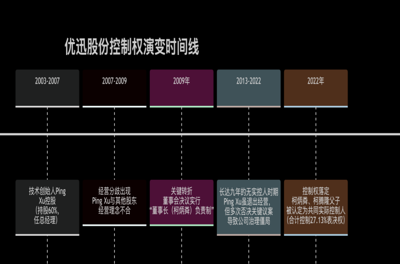 创业初期,技术领袖徐平以技术出资持有60%股权,出任总经理,主导研发;柯炳粦持股12%,负责融资与运营。但优迅股份的发展并未延续初期的良好开局。因优迅股份在技术开发与盈利进度上未达预期,自2007年起,创始人徐平与其他股东及管理层之间在经营理念上出现显著分歧。2009年3月,董事会决议将优迅股份管理体制调整为“董事长负责制”,由柯炳粦全面接手公司经营管理。与此同时,徐平的薪酬被下调,矛盾进一步激化。2013年PingXu不再实际履职,2015年正式辞职,优讯股份进入无实控人阶段。