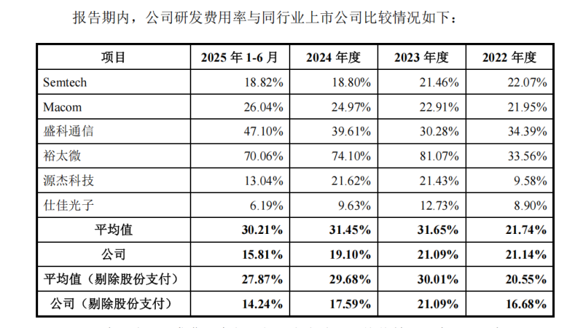 2023年和2024年,行业可比上市公司的研发费用率均值分别达到31.65% 和31.45%,而优迅股份同期的研发费用率要比行业均值低约10个百分点。即便在2025年上半年,其研发费用率也显著低于裕太微、盛科通信等可比公司研发费用率平均值。