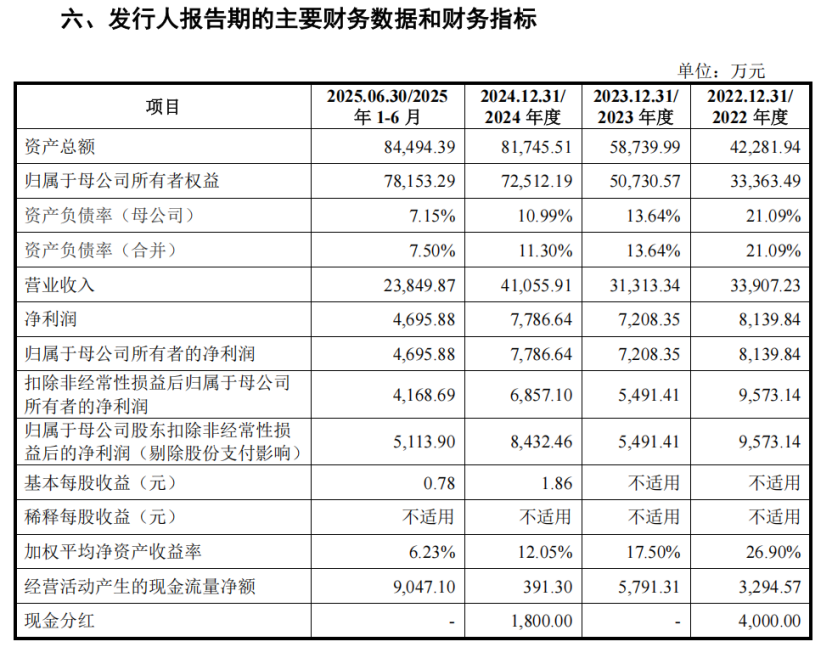 2022年至2025年上半年,优迅股份营业收入分别为3.39亿元、3.13亿元、4.11亿元、2.39亿元。净利润分别为8139.84万元、7208.35万元、7786.64万元、4,695.88万元。经营活动净现金流分别为3294.57万元、5791.31万元、391.30万元、9047.10万元。扣除非经常性损益后的净利润分别为9,573.14万元、5,491.41万元、6,857.10万元、4,168.69万元。