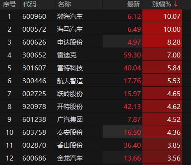 上证报中国证券网讯 10月15日早盘,汽车板块拉升,截至9时38分,渤海汽车、海马汽车涨停,申达股份、雷迪克、广汽集团、跃岭股份等跟涨。