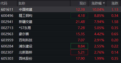 上证报中国证券网讯 10月15日早盘,建筑板块拉升,截至9时45分,中国核建涨停,精工钢构涨逾8%,新疆交建涨近8%,豪尔赛、百利科技、浦东建设等跟涨。