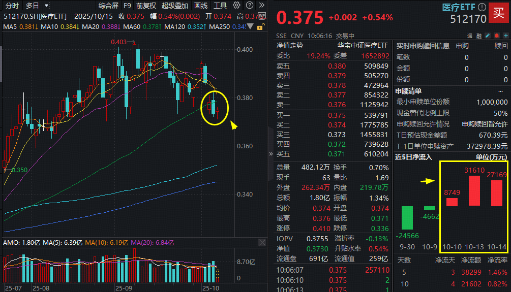 值得关注的是,医疗ETF(512170)资金面或现重大信号!近日其场内价格围绕60日均线震荡,巨量资金开始“抄底”,截至10月14日,512170近3日连续吸金合计6.75亿元。