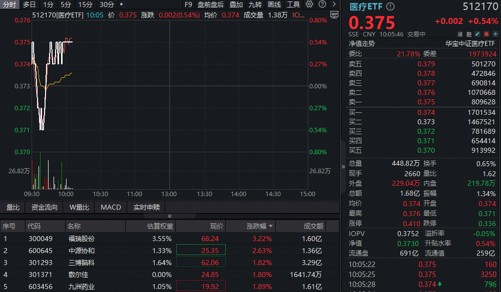 10月15日早盘,医疗板块大面积回暖,A股最大医疗ETF(512170)溢价飘红,成交超1.6亿元。该ETF最新规模为258.49亿元,在全市场医药医疗类ETF中高居首位。