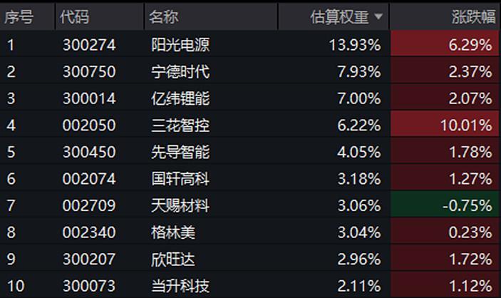 电池板块:阳光电源、先导智能、天赐材料、宁德时代、国轩高科、欣旺达、三花智控、亿纬锂能、格林美、银轮股份(成分股仅做展示使用,不构成投资建议)