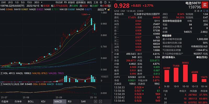 10月15日,A股市场震荡回暖,电池板块午后强势反弹!截至14:00,同类规模领先、费率最低档的$电池50ETF(159796)放量大涨近3%,成交额快速突破4.5亿元,资金持续涌入电池板块,$电池50ETF(159796)此前已连续10日强势吸金超38亿元!