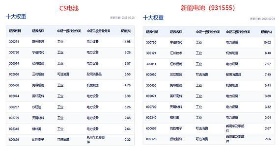 且对比前十大成分股来看,$电池50ETF(159796)标的指数聚焦储能与动力电池两大黄金板块,其中第一权重股光伏逆变器龙头占比达14.95%,其余同类指数不含该成分股,此外还涵盖全球动力电池龙头、固态电池先行者等优势企业。