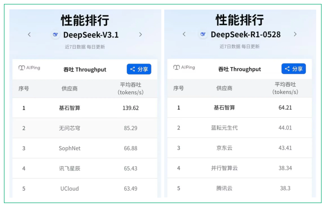 青云科技旗下 AI 算力云服务——基石智算CoresHub 近日加入 AI Ping 大模型服务性能评测,在近一周的连续评测中,所提供的 DeepSeek-R1-0528 与 DeepSeek-V3.1 两个模型服务,平均输出吞吐性能指标排名第一。根据清华大学与中国软件评测中心联合发布的《2025 大模型服务性能排行榜》中的评测标准,AI Ping 提供大模型服务性能评测与信息汇总。