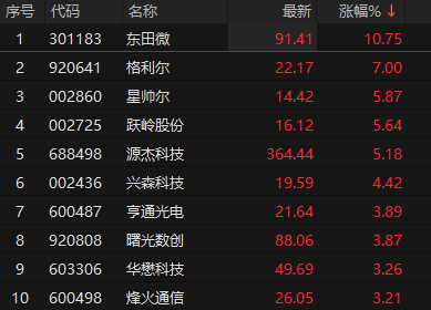 上证报中国证券网讯 10月15日午后,光通信模块震荡走强,截至14时10分,东田微涨超10%,星帅尔、跃岭股份、源杰科技涨逾5%,兴森科技、亨通光电等跟涨。