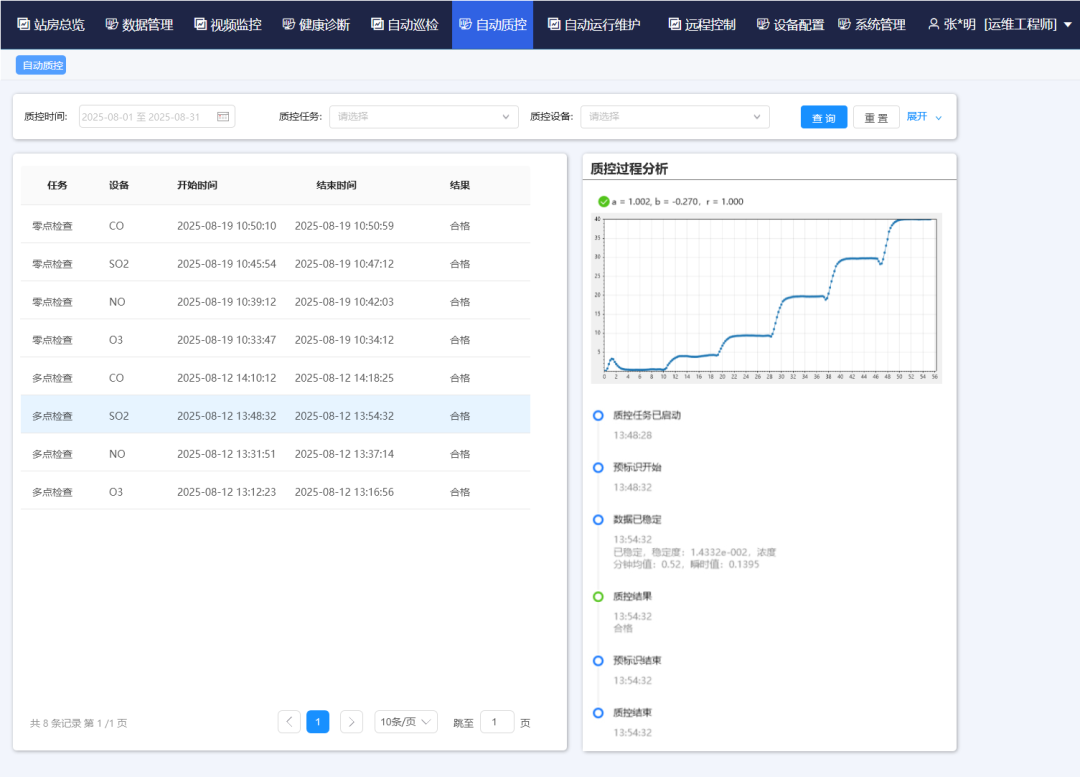 气态智能质控:实现气态污染物分析仪的零点、跨度、线性、转换效率的核查及校准,并对精密度、准确度进行自动审核,同时具备质控异常智能预警功能
