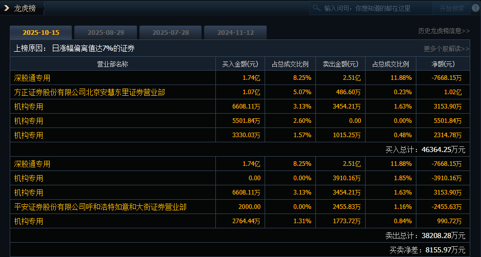 兴森科技(002436)今日涨停,成交额21.14亿元,换手率7.15%,盘后龙虎榜数据显示,深股通专用席位买入1.74亿元并卖出2.51亿元,4家机构专用席位净买入1.20亿元,有1家机构专用席位净卖出3910.16万元。