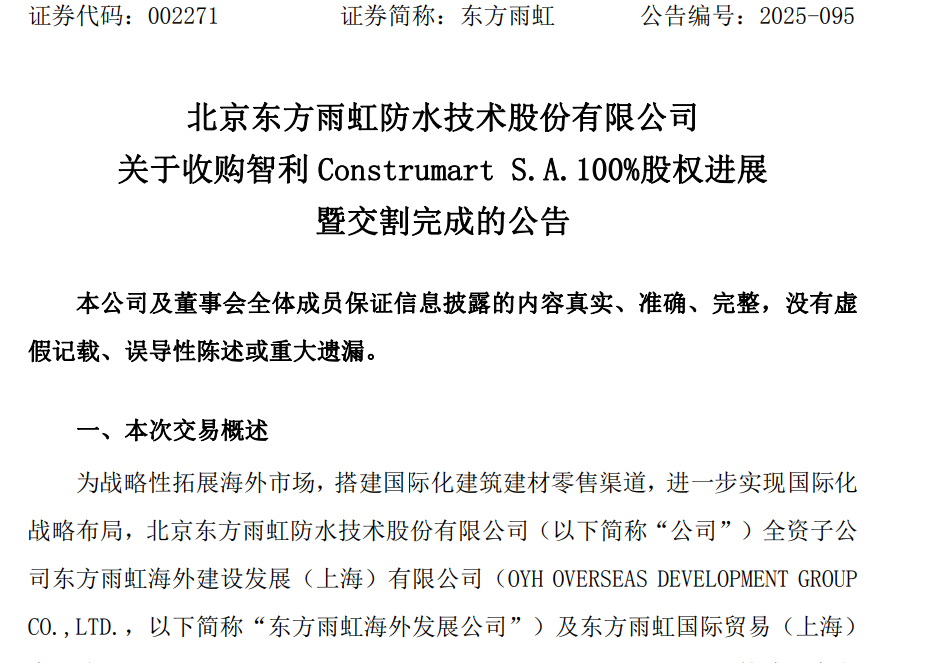 10月14日,东方雨虹(002271.SZ)发布公告,宣布其收购智利建筑零售企业Construmart S.A.100%股权的交易已正式完成交割。
