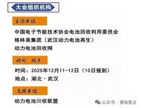 动力电池回收网消息,“2025中国动力电池回收利用行业回收年会暨新型、高效提锂技术发展论坛”将于12月11-12日在武汉举办,规模:500+,大会主题:绿色循环·高效提锂。