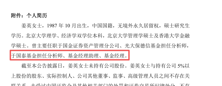 个人简历显示,姜英,1987年10月出生,北京大学理学、经济学双学位本科,北京大学管理学硕士及香港大学金融学硕士。姜英曾任职于国金证券资产管理分公司、光大保德信基金,曾在国泰基金担任分析师、基金经理助理、基金经理。值得注意的是,基金经理出任上市公司董秘,这一职场路径在基金行业内较为罕见。