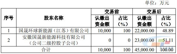 在安徽国晟新能源增资的同时,国晟环球新能源(江苏)有限公司(以下简称“江苏环球”)也对铁岭环球进行增资12,000万元。此次增资完成后,铁岭环球注册资本增加至45,000万元,其中安徽国晟新能源持股51.11%。铁岭环球将纳入国晟科技合并报表范围。