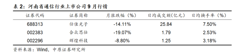 2025年9月,沪深两市河南相关通信行业有3家上市公司,其中,仕佳光子下跌14.11%,合众思壮下跌19.07%,辉煌科技下跌8.80%。