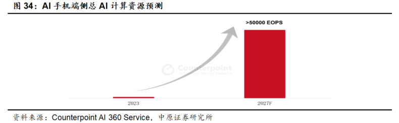 由于AI手机存量规模不断增长,同时每台手机所拥有的AI算力也在不断增加,两相作用下,全球智能手机的总体AI算力将呈现指数级增长态势。根据Counterpoint Research的估算,2027年生成式AI手机端侧整体AI算力将会达到50000 EOPS以上。在未来,生成式AI手机将会成为重要的AI计算资源池,这也印证端云结合部署模式的可行性、经济性和必要性。