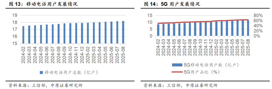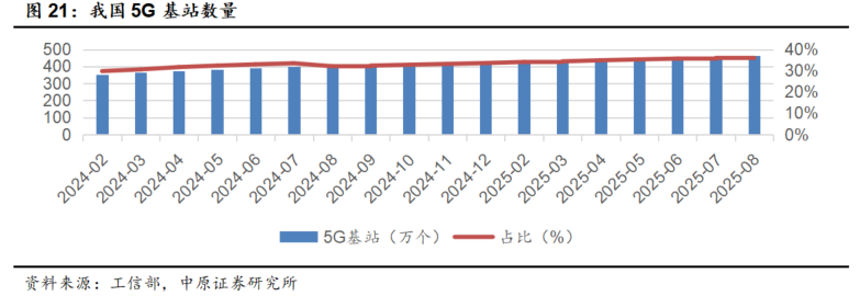 5G网络建设持续推进。截至2025年8月,5G基站总数达464.6万个,比2024年末净增39.5万个,占移动基站总数的36.3%,占比较2025年1-7月提高0.3pct。5G基站建设预计保持平稳增长。