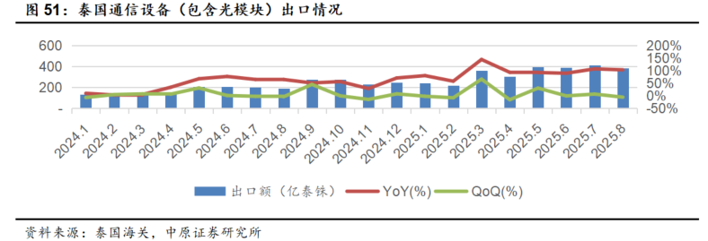 HS编码为8517.62.00的通信设备主要包括光模块、交换机、路由器等。据泰国海关统计,2025年8月,包含光模块在内的通信设备(HS code: 8517.62.00)出口额为386.01亿泰铢,同比+103.0%;2025年1-8月,包含光模块在内的通信设备(HS code: 8517.62.00)出口额为2704.53亿泰铢,同比+96.3%。