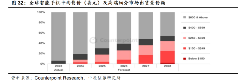 预计从2025年起,AI手机将从高端机型逐渐普及至中端机型,反映出端侧生成式AI作为更普适性的先进技术渗透整体手机市场的趋势。根据Counterpoint Research的测算,具备生成式 AI能力的设备在25H1占高端智能手机(批发价高于600美元)销售的80%以上。高端消费者持续青睐前沿创新,各品牌也在将生成式AI打造成该细分市场的下一代关键差异因素。随着硬件差距的缩小,消费者的选择将越来越依赖于AI生态系统。到2026-2027年,生成式AI的采用将分别扩展到高端(400-599美元)和中高端(250-399美元)市场,预计这些市场将占生成式AI出货量的30%左右。硬件和软件的进步正在使生成式AI普及,到2027-2028年,可能会推动250美元以下智能手机采用生成式AI。