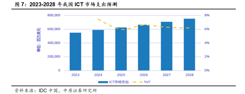 IDC预测2028年我国ICT市场规模将接近7517.6亿美元,5年CAGR为6.5%。其中,消费端在政策刺激与新兴技术产品推动下迎来复苏,智能终端需求有所增长。企业视角下,2024年我国企业级ICT市场规模约为2693.6亿美元,同比增长11.7%,高于GDP增速。自2024年起,我国企业级ICT市场预计将以每年11.5%的复合增长率增长,到2028年我国企业级ICT市场规模将接近4150亿美元。出海、云计算、AI及算力部署成为市场增长核心引擎。