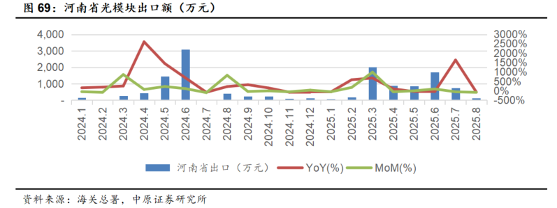 2025年8月,河南省单月光模块出口额为132.39万元,同比-66.9%,环比-82.4%。2025年1-8月,河南省光模块出口总额为6612.78万元,同比+12.70%。