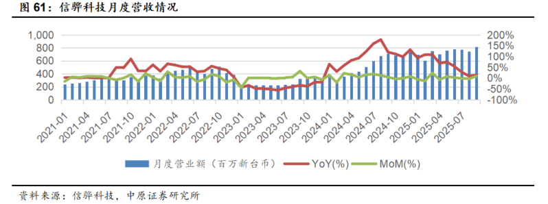 信骅科技(ASPEED)是全球服务器BMC(基板管理控制器)芯片的龙头厂商,2024年,公司在全球服务器远端管理芯片市场的份额维持在70%左右,服务器BMC业务占公司营收比重超90%。公司在全球服务器管理芯片市场处于主导地位,收入结构清晰,经营数据月度披露,由于每台服务器主机板至少配备一片BMC控制芯片,公司营收数据可作为全球云厂商资本开支和服务器行业景气度的前瞻指标,能够提前2-3个月体现服务器市场景气度的变化。2025年9月,信骅科技实现营收8.14亿新台币,同比+15.0%,环比+9.4%。2025年1-9月,信骅科技累计实现营收66.42亿新台币,同比+52.5%。