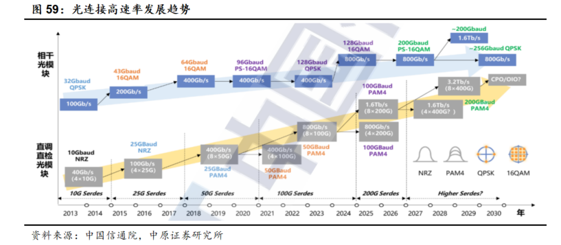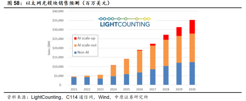 高速率光模块迭代周期缩短。数据/智算中心内部网络架构趋向扁平化,连接密度及交换容量大幅增长。在数据流量激增和网络架构演进双重驱动下,光连接技术向高速率、大容量、高可靠、低能耗、低时延、智能化等方向发展演进,其中高速率是最核心发展诉求。当前,数据/智算中心互联已成为最主要应用场景,市场规模约为电信网络的1.5-2倍,早期为3-4年更新一代,AI影响下迭代周期将进一步缩短。