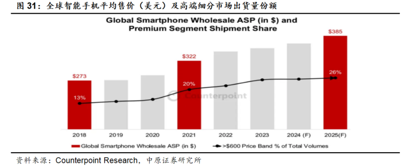 受SoC和内存价格上涨以及生成式AI设备的推动,智能手机的平均售价上升。根据Counterpoint Research的测算,2025年全球智能手机的平均销售价格将同比增长5%。这一增长由多重因素引起,包括智能手机向5G转型、算力的提高以及向高端智能手机的明显转向等。2025年,消费者对生成式AI的兴趣增加将主要支持高端化趋势,因为生成式AI需要在CPU、NPU和GPU能力方面有显著提升的SoC。此外,在成熟的智能手机市场上,手机的更换周期更长,手机厂商需要采用包括生成式AI在内的先进科技来促进高端市场产品的不断升级。