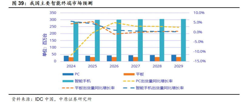 DeepSeek推出后,其对于终端市场规模的影响将逐渐在2-5年间起到显著的带动作用。我国市场上,IDC预计PC、平板和智能手机出货量未来五年复合增长率将分别实现2.6%,1.0%和1.3%。随着华为、联想、荣耀、OPPO、vivo等终端厂商陆续接入DeepSeek,其终端设备的智能化水平将通过自然语言处理和多模态推理能力,实现更流畅的语音交互和更智能的自动化控制,并加速AI终端应用落地。DeepSeek有利于端侧部署底层模型统一化,通过提升兼容性推动端侧AI生态建设。DeepSeek以其轻量化优势,更好的适配终端设备,降低了模型的存储和计算需求,为终端设备的底层模型统一化提供更多可能。DeepSeek通过模型优化、软硬协同、跨平台适配等技术手段,显著提升终端设备端侧部署的兼容性,加上其轻量化版本能够适配从低端到高端芯片的多种硬件,进一步推动端侧AI的生态建设。