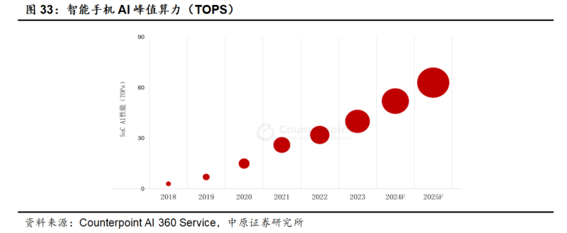 SoC的TOPS性能与生成式AI手机的AI能力紧密相关。智能手机AI能力正变得越来越强大,而手机芯片厂商在这一转变中扮演重要角色。Counterpoint Research预计旗舰智能手机的芯片峰值AI算力水平将继续增长,2025年将会达到60 TOPS以上。