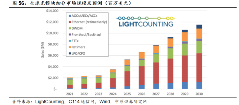 LightCounting预计光通信芯片组市场将在2025-2030年的CAGR为17%,总销售额将从2024年的约35亿美元增至2030年的超110亿美元。2024年,超大规模云服务商对AI基础设施的巨额投资推动400G/800G以太网光模块出货量激增,进而拉动PAM4芯片组(DSP、驱动器和TIA)需求,该趋势在2025年持续加强。目前以太网和DWDM占据市场主导地位,而用于交换机ASIC与可插拔端口之间作为板载重定时器的PAM4 DSP芯片则是第三大细分市场。下图展示了整个潜在市场(TAM),其中包括除 PAM4 和相干之外的其他调制类型,尤其是FTTx和前传/回传领域。