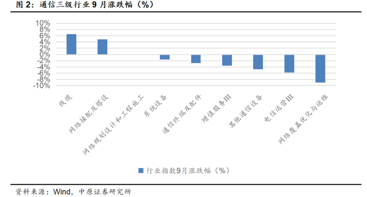 2025年9月(2025.09.01-2025.09.30)通信行业各子板块涨少跌多。三级行业中,线缆、网络接配及塔设分别上涨6.49%、4.89%。